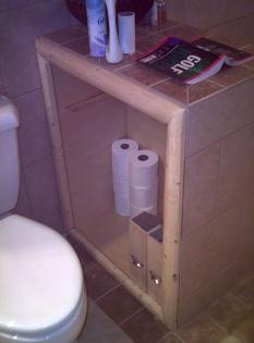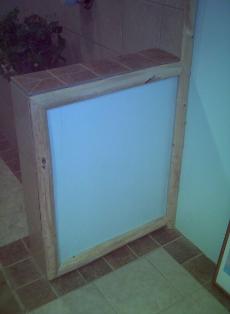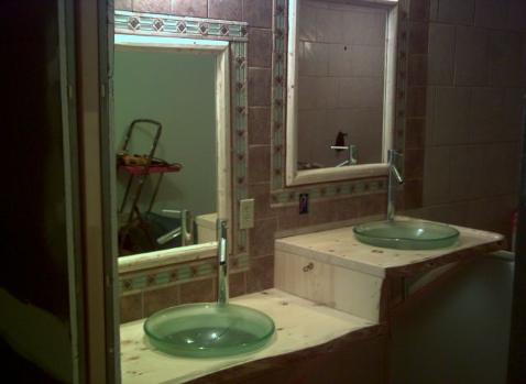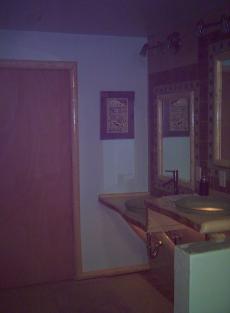 | Having completed the counter top, this bathroom has been trimmed with more spruce around the two wall sections outside the shower stall. The storage area next to the throne also has a shelf, which has been trimmed with...of course, white spruce. The center picture is the view from the shower entryway, between the two small sections, looking toward the door. From here, the braces on the counter top are more easily seen. The soft glow in the sinks is from a set of rope lights, run along the wall underneath the counter top- these serve as a night light for the entire bathroom floor, and give a beautiful warm glow to the glass sinks. Trim as shown- $ 15.00 per foot |