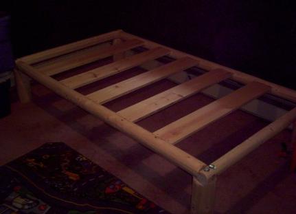 | A nice, simple frame for a child's bed, this frame is sturdy log construction in a twin size. There is plenty of room underneath for drawers or storage boxes (12" clearance), and the child is raised off the floor, avoiding cool drafts. As shown, $375.00 Queen, $ 450.00--King (not recommended due to size), $ 525.00 |