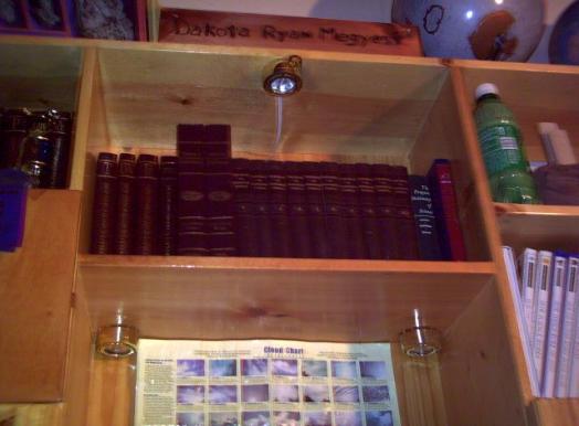 | Mounted work lights illuminate desk area. Plugged into 6-plug power bar under the desk, only one outlet is needed for electrical supply. |