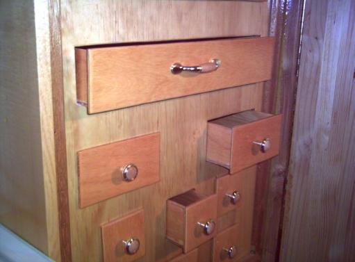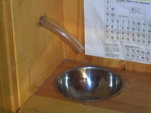 | Flush-mounted basin with drain, for rinsing. Both water bottles (supply and drain) lock away out of sight, and entire water system is self-contained. |