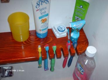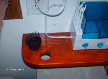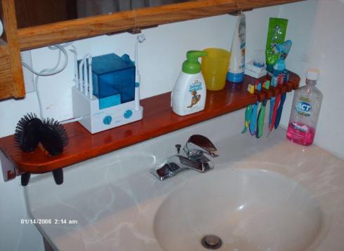 | Handy shelf keeps brushes, combs, toothbrushes and toothpaste off the counter and away from small hands and water. |