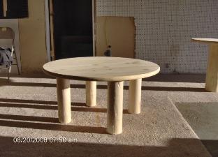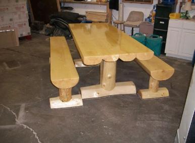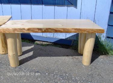| The latest addition to the selection of tables- this log dining room table and benches makes the perfect compliment to a log house's kitchen or deck. At 7 feet long, it can easily seat 8 people. Solid log construction means it will last for generations, and carpet pads on the feet make it safe for any kind of floor. |