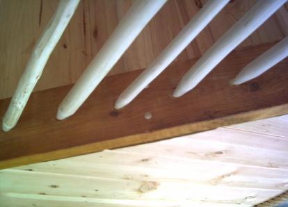 | The individual components are installed, held in place and to each other by wood dowel pegs. The balusters are tapered at each end, and inset at the top and bottom into floor and rail. |