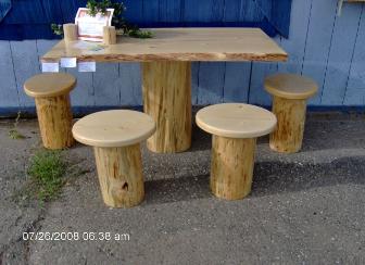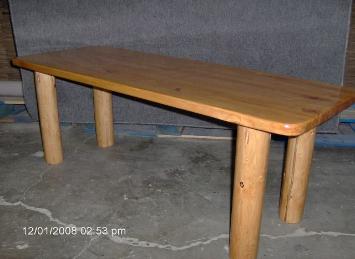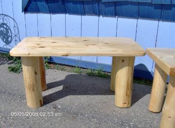| The latest addition to the selection of tables- this log dining room table and benches makes the perfect compliment to a log house's kitchen or deck. At 7 feet long, it can easily seat 8 people. Solid log construction means it will last for generations, and carpet pads on the feet make it safe for any kind of floor. |