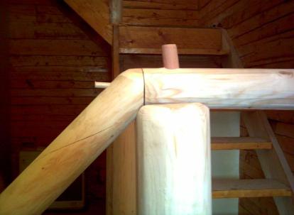 | The individual components are installed, held in place and to each other by wood dowel pegs. The balusters are tapered at each end, and inset at the top and bottom into floor and rail. |